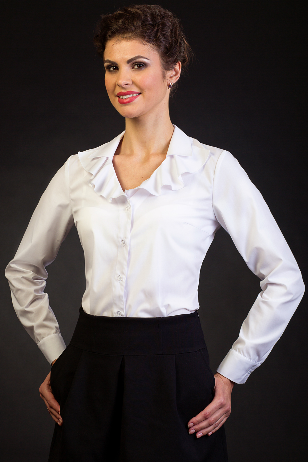 Небольшой воротник прекрасно сочетается с женственным воланом и изящным вырезом горловины Ткань: 55% хлопок, 45% ПЭ. Цвет: Белый