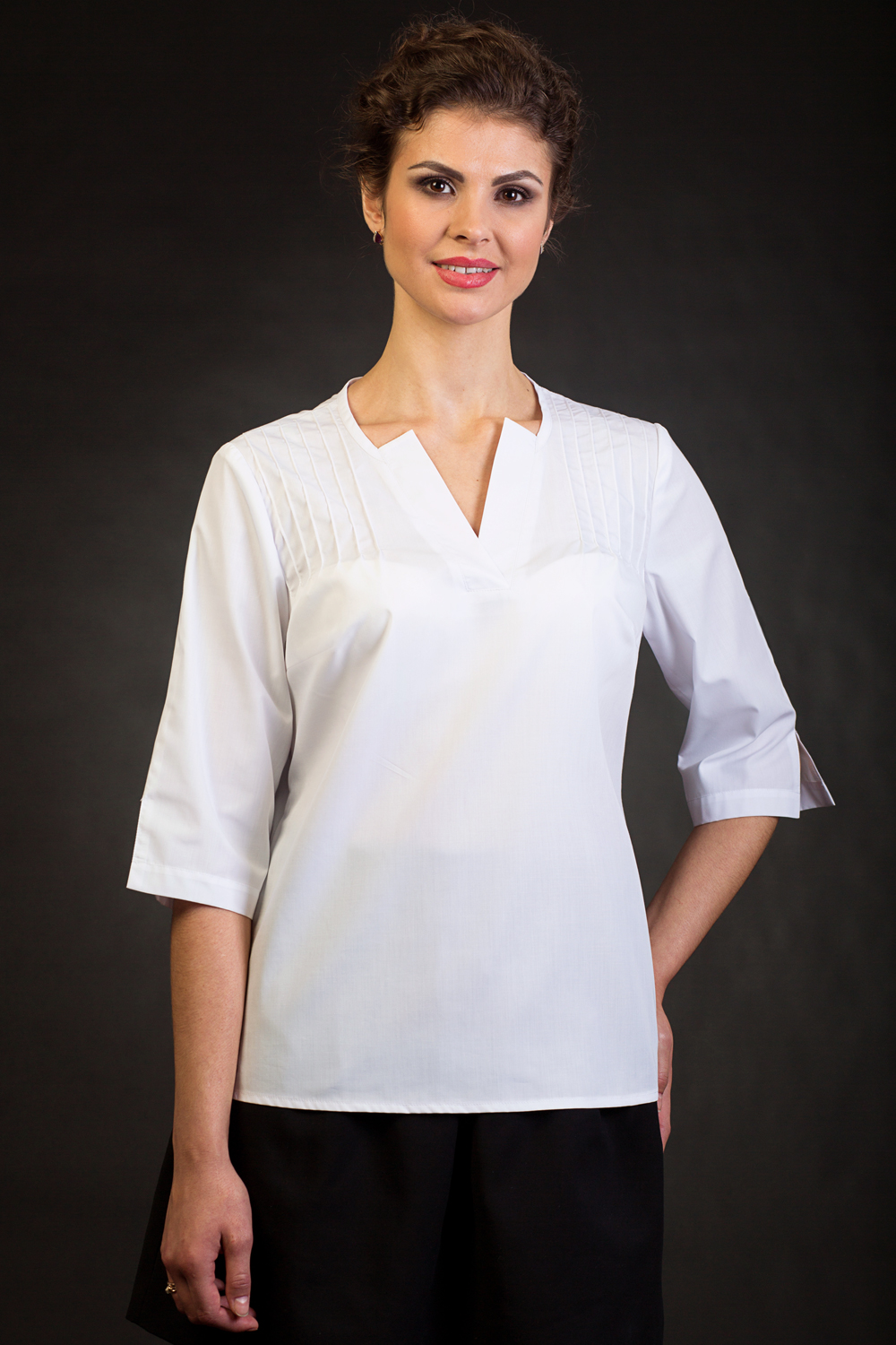 Простая блузка с необычным вырезом горловины , нежными складками по линии кокетки и разрезом по низу рукава. Ткань: 55% хлопок, 45% ПЭ. Цвет: Белый