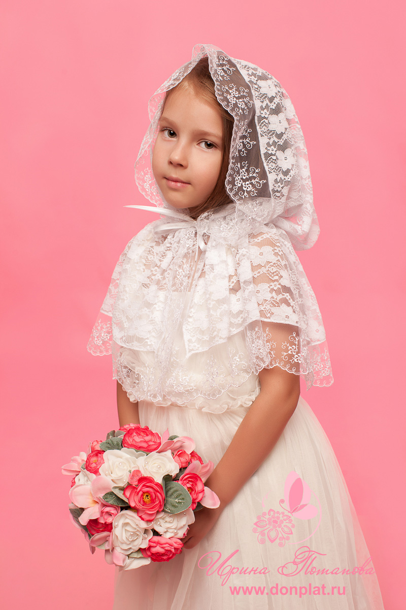 Отличие этой модели в том, что оборка (горжетка) в модели "Надежда" закруглена. Кружево расположено по краю изделия со всех сторон. Платок завязывается на атласные ленты.