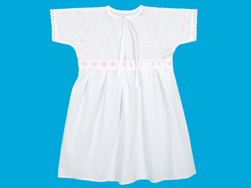 Рубашечка для крещения из тонкой хлопчатобумажной ткани на кокетке и коротким цельнокроенным рукавом. Кокетка переда выполнена из вышитой ткани с разрезом, шов соединения с юбкой отделан шитьём и атласной лентой, по юбке заложены мягкие складки. Горловина обработана бейкой с завязкой на бант. Отделка х/б шитьём по рукавам.