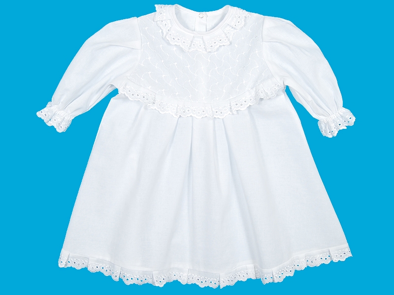 Рубашечка для крещения из тонкой хлопчатобумажной ткани на закругленной кокетке. По переду и спинке заложены мягкие складки, кокетка переда выполнена из вышитой ткани. Рукав длинный втачной, собранный на спандекс. Застёжка по спинке на кнопки. Отделка узким х/б шитьём по горловине, кокеткам, рукавам и низу рубашечки.
