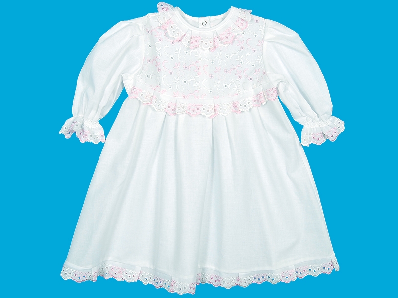 Рубашечка для крещения из тонкой хлопчатобумажной ткани на закругленной кокетке. По переду и спинке заложены мягкие складки, кокетка переда выполнена из вышитой ткани. Рукав длинный втачной, собранный на спандекс. Застёжка по спинке на кнопки. Отделка узким х/б шитьём по горловине, кокеткам, рукавам и низу рубашечки.