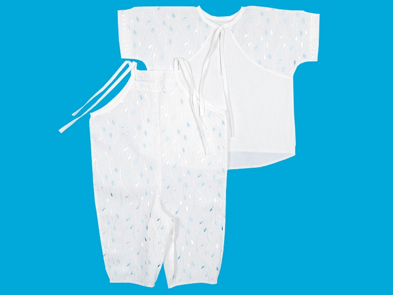 Комплект крестильный для мальчика, состоящий из рубашечки и полукомбинезона. Рубашечка из тонкой хлопчатобумажной ткани на закругленной кокетке из вышитой ткани. Перед с разрезом, горловина обработана бейкой с завязкой на бант. Отделка х/б шитьём по рукавам. Полукомбинезон на завязках по верху. Передняя часть выполнена из вышитой ткани с отделкой по верхнему краю узким х/б шитьем. Задняя часть из тонкой хлопчатобумажной ткани.