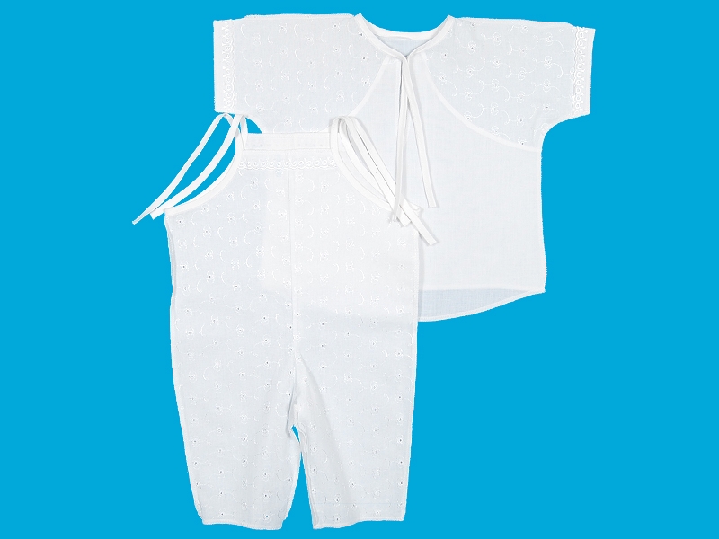 Комплект крестильный для мальчика, состоящий из рубашечки и полукомбинезона. Рубашечка из тонкой хлопчатобумажной ткани на закругленной кокетке из вышитой ткани. Перед с разрезом, горловина обработана бейкой с завязкой на бант. Отделка х/б шитьём по рукавам. Полукомбинезон на завязках по верху. Передняя часть выполнена из вышитой ткани с отделкой по верхнему краю узким х/б шитьем. Задняя часть из тонкой хлопчатобумажной ткани.