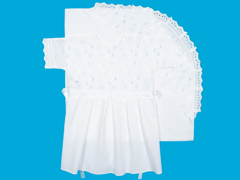 Комплект для крещения из тонкой хлопчатобумажной ткани, состоящий из рубашечки и пеленки. Рубашечка на кокетке и коротким цельнокроенным рукавом. Кокетка переда выполнена из вышитой ткани, шов соединения с юбкой отделан узким х/б шитьем, по юбке заложены мягкие складки. Спинка с запахом, завязывающимся на атласную ленту. Отделка узким х/б шитьём по рукавам. Пеленка 90*90 с капюшоном из вышитой ткани, отделанным узким х/б шитьем.