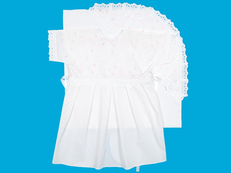Комплект для крещения из тонкой хлопчатобумажной ткани, состоящий из рубашечки и пеленки. Рубашечка на кокетке и коротким цельнокроенным рукавом. Кокетка переда выполнена из вышитой ткани, шов соединения с юбкой отделан узким х/б шитьем, по юбке заложены мягкие складки. Спинка с запахом, завязывающимся на атласную ленту. Отделка узким х/б шитьём по рукавам. Пеленка 90*90 с капюшоном из вышитой ткани, отделанным узким х/б шитьем.