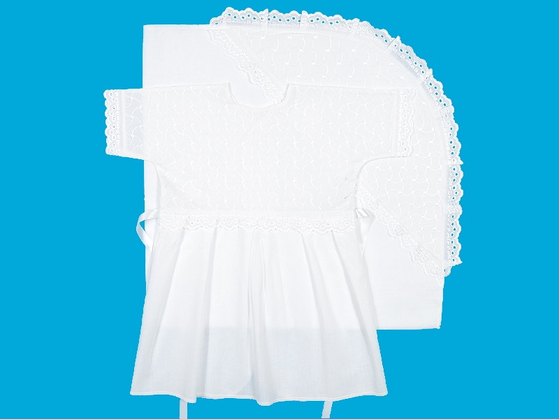 Комплект для крещения из тонкой хлопчатобумажной ткани, состоящий из рубашечки и пеленки. Рубашечка на кокетке и коротким цельнокроенным рукавом. Кокетка переда выполнена из вышитой ткани, шов соединения с юбкой отделан узким х/б шитьем, по юбке заложены мягкие складки. Спинка с запахом, завязывающимся на атласную ленту. Отделка узким х/б шитьём по рукавам. Пеленка 90*90 с капюшоном из вышитой ткани, отделанным узким х/б шитьем.