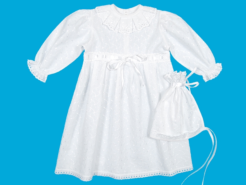 Комплект для крещения из вышитой ткани, состоящий из рубашечки и чепчика. Рубашечка для крещения из вышитой ткани с длинным рукавом, собранным на спандекс, отрезная по талии. Шов соединения с юбкой отделан шитьем и атласной лентой, завязанной на бант, по юбке заложены мягкие складки. Горловина отделана широким шитьем, заложенным складками и обработана бейкой. Застежка по спинке на кнопки. Отделка х/б шитьем по низу рукава и низу изделия. Чепчик (косынка) выполнен из вышитой ткани, собранный по верхнему краю. Отделка по верхнему и нижнему краю узким х/б шитьем.