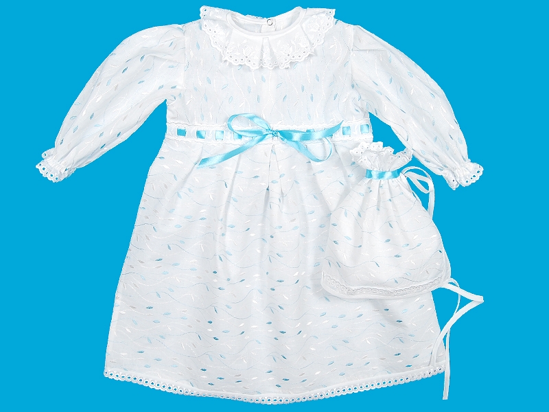 Комплект для крещения из вышитой ткани, состоящий из рубашечки и чепчика. Рубашечка для крещения из вышитой ткани с длинным рукавом, собранным на спандекс, отрезная по талии. Шов соединения с юбкой отделан шитьем и атласной лентой, завязанной на бант, по юбке заложены мягкие складки. Горловина отделана широким шитьем, заложенным складками и обработана бейкой. Застежка по спинке на кнопки. Отделка х/б шитьем по низу рукава и низу изделия. Чепчик (косынка) выполнен из вышитой ткани, собранный по верхнему краю. Отделка по верхнему и нижнему краю узким х/б шитьем.