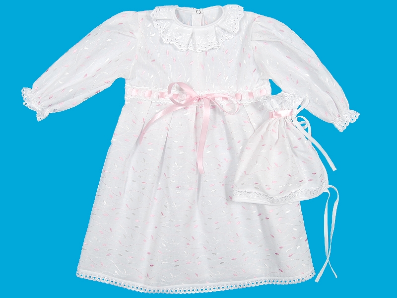 Комплект для крещения из вышитой ткани, состоящий из рубашечки и чепчика. Рубашечка для крещения из вышитой ткани с длинным рукавом, собранным на спандекс, отрезная по талии. Шов соединения с юбкой отделан шитьем и атласной лентой, завязанной на бант, по юбке заложены мягкие складки. Горловина отделана широким шитьем, заложенным складками и обработана бейкой. Застежка по спинке на кнопки. Отделка х/б шитьем по низу рукава и низу изделия. Чепчик (косынка) выполнен из вышитой ткани, собранный по верхнему краю. Отделка по верхнему и нижнему краю узким х/б шитьем.