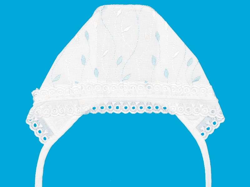 Чепчик выполнен из тонкой хлопчатобумажной ткани, верх дублирован вышитой тканью. Отделка по лицевому шву двумя рядами узким х/б шитьем . Швы на лицевую сторону.