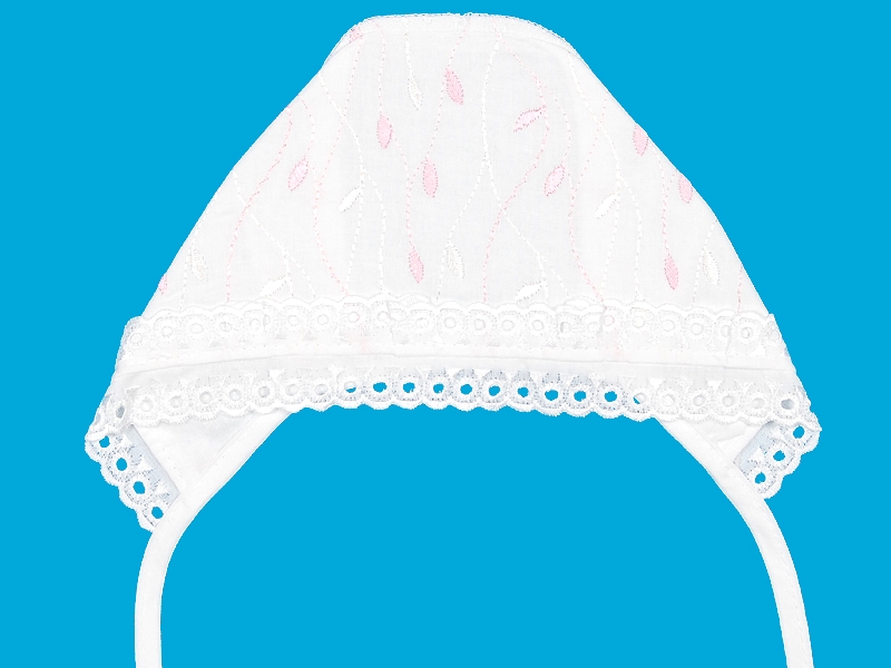 Чепчик выполнен из тонкой хлопчатобумажной ткани, верх дублирован вышитой тканью. Отделка по лицевому шву двумя рядами узким х/б шитьем . Швы на лицевую сторону.