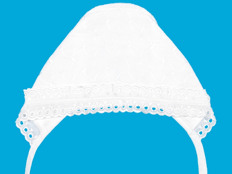 Чепчик выполнен из тонкой хлопчатобумажной ткани, верх дублирован вышитой тканью. Отделка по лицевому шву двумя рядами узким х/б шитьем . Швы на лицевую сторону.
