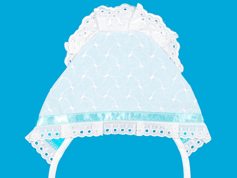 Чепчик выполнен из вышитой хлопчатобумажной ткани на утеплённом подкладе из фланели. Отделка по лицевому шву узким х/б шитьём и атласной лентой, по затылочному шву широким х/б шитьём, заложенным складками. Швы на лицевую сторону.