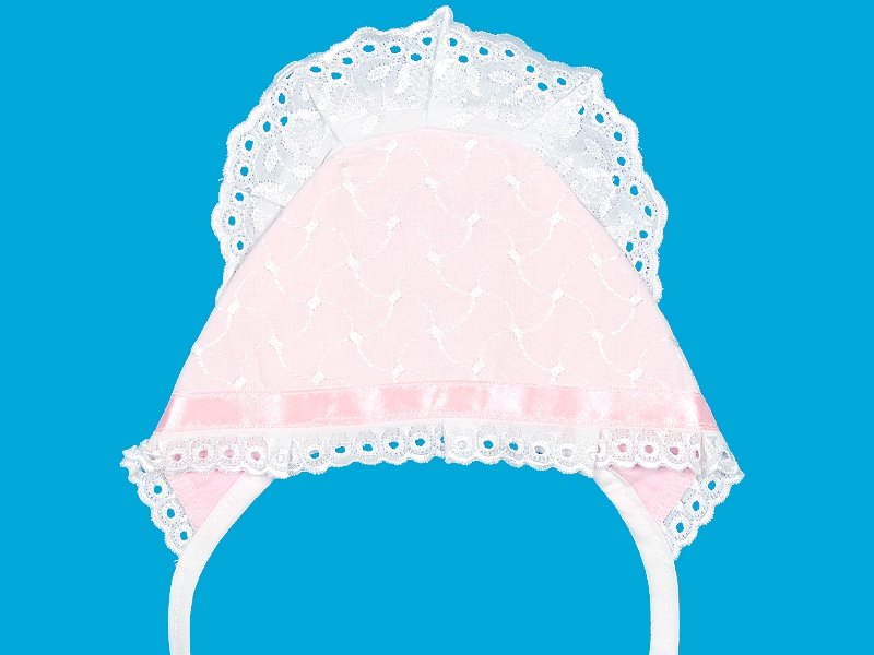 Чепчик выполнен из вышитой хлопчатобумажной ткани на утеплённом подкладе из фланели. Отделка по лицевому шву узким х/б шитьём и атласной лентой, по затылочному шву широким х/б шитьём, заложенным складками. Швы на лицевую сторону.