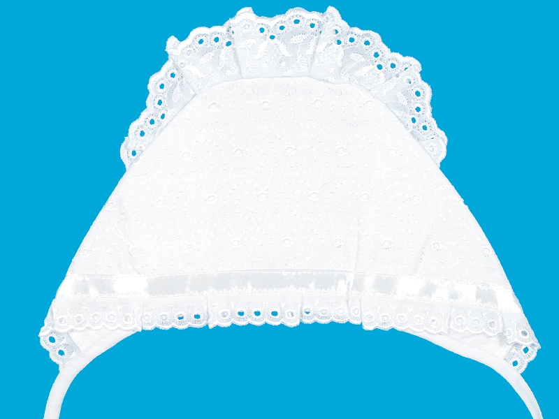 Чепчик выполнен из вышитой хлопчатобумажной ткани на утеплённом подкладе из фланели. Отделка по лицевому шву узким х/б шитьём и атласной лентой, по затылочному шву широким х/б шитьём, заложенным складками. Швы на лицевую сторону.