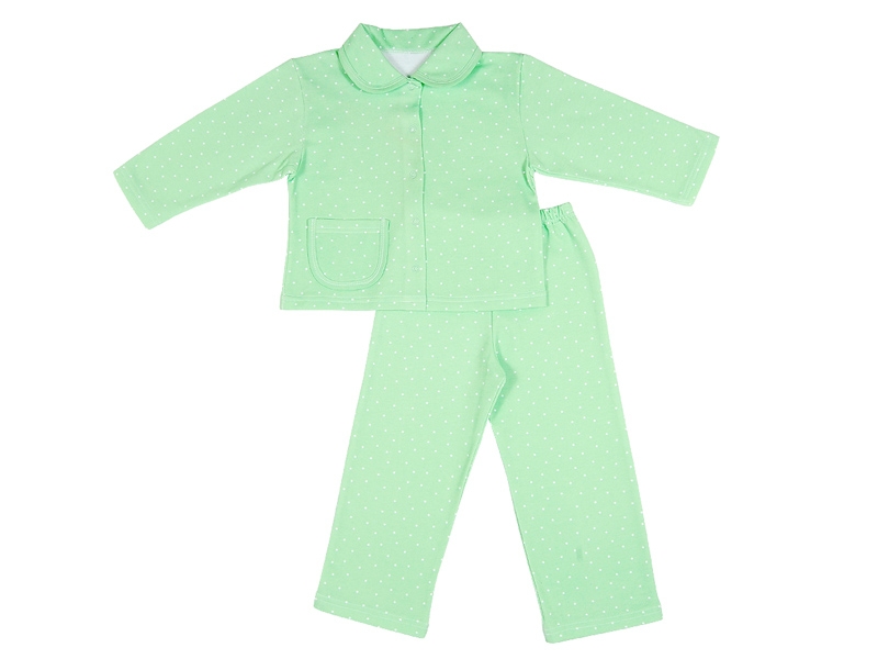 Пижама из утеплённого полотна с начесом (футер) с длинными рукавами и брюками на резинке. Воротник отложной. Перед дополнен карманом, застёжка на кнопки.