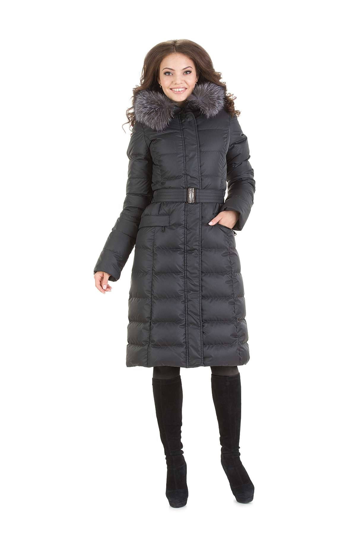 Стеганое приталенное пальто с двумя горизонтальными карманами. Благодаря длине ниже колена и регулируемому капюшону с мехом изделие получается тёплым и практичным. Универсальность модели подчеркивают простота кроя, а также универсальной.