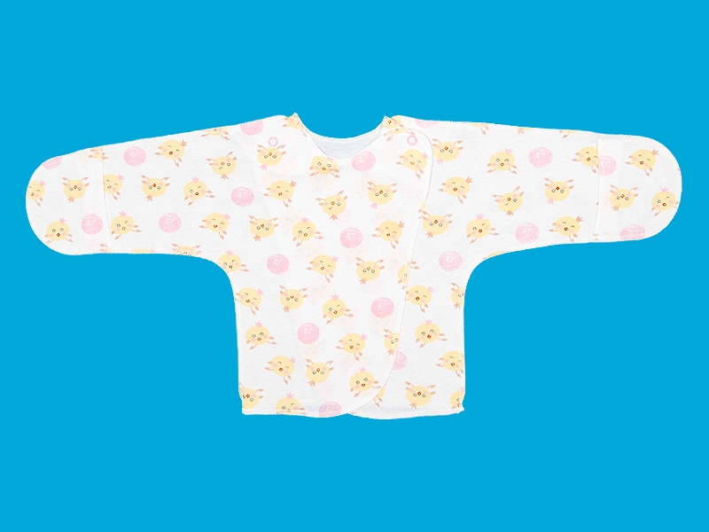 Распашонка выполнена швами на лицевую сторону из тонкого трикотажного полотна (кулирка). Рукава с закрытыми ручками, при отгибании нижней детали получается открытый рукав. Застёжка на кнопки на уровне плеча.