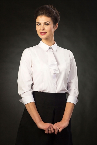 Конечно необычный волан, декоративная пуговица в виде броши, и женственные отложные манжеты по низу рукава.
