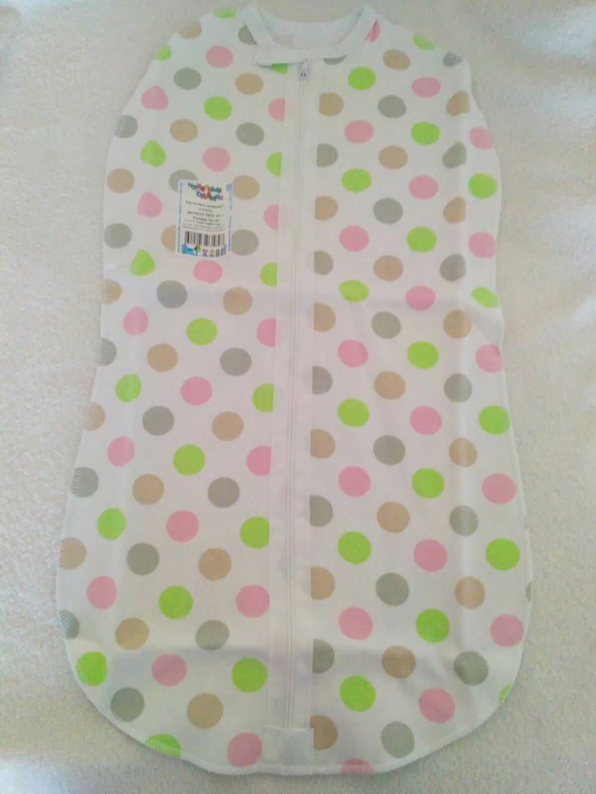 Пеленка - конверт () из утепленного трикотажного полотна с начесом (футер). Застежка - молния, не соприкасающаяся с телом ребенка, горловина обработана бейкой с застежкой на кнопку, не прилегающая к телу. Швы на лицевую сторону. Размер 51х29 см, на возраст от 0 до 3 месяцев