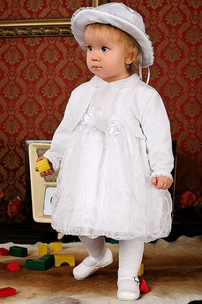 Характеристика: Платье изготовлено из атласа, украшено цветами. Болеро из высококачественной пряжи; Комплект включает в себя: платье, брошь, регулируемая шляпка в комплекте до 86 р-ра, болеро.