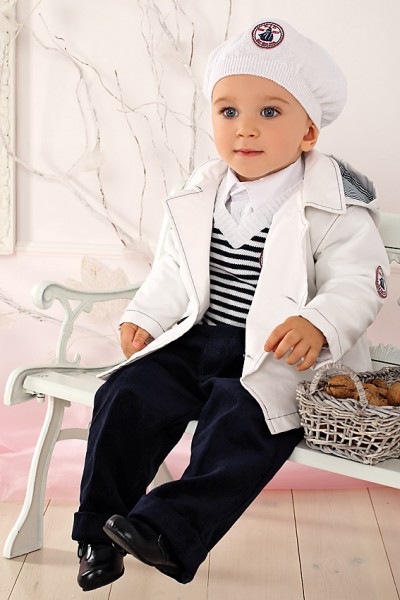 Комплект включает: куртка из хлопка со съемным капюшоном, жилет из хлопка в полоску, вельветовые брюки с манжетами, рубашка из хлопка с длинным рукавом, трикотажная шапочка. (шапочка идет в комплекте до 86 р-ра)