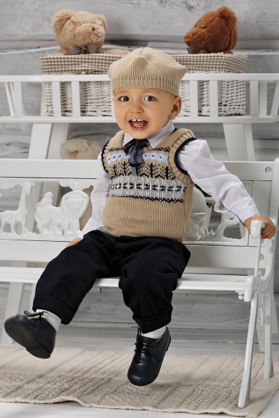 Комплект включает в себя: свитер норвежской модели с коротким рукавом, брюки с манжетами, хлобчатобумажная рубашка, вязаная шапка. (шапочка идет в комплекте до 86 р-ра)
