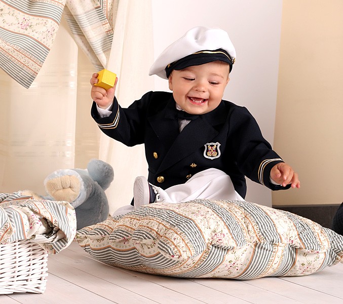 Комплект включает в себя: двубортный пиджак с золотыми пуговицами, брюки, хлобчатобумажная рубашка, шляпа, галстук-бабочка. (шапочка идет в комплекте до 86 р-ра)
