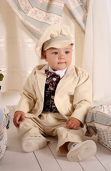Комплект включает в себя: пиджак с подкладкой, жаккардовый жилет, брюки с манжетами, хлобчатобумажная рубашка, шляпа, галстук-бабочка. (шапочка идет в комплекте до 86 р-ра)