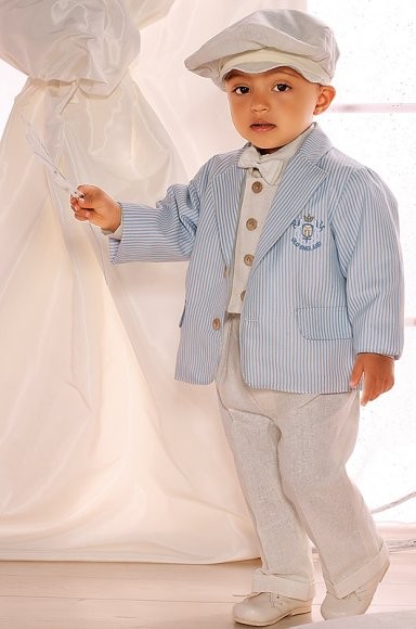 Комплект включает в себя: пиджак хлопковый, жилет, галстук-бабочка, брюки льняные, хлопчатобумажная рубашка, шапка.