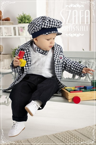 Комплект включает в себя: жилет, пиджак, брюки с манжетами, хлобчатобумажная рубашка, шляпа, галстук-бабочка. (шапочка идет в комплекте до 86 р-ра)